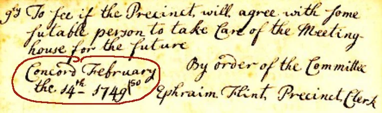 The change made the tasks of town clerks at least a bit easier. Until this change, when a birth, marriage, death, or town transaction fell between January 1st and March 25th, what year were the clerks supposed to write down? The year observed by the public, or the British legal year? Ephraim Flint of Lincoln solved the puzzle by writing both years — February the 14th-1749/50. At last, on January 1st, 1752, such British stubbornness finally came to an end.